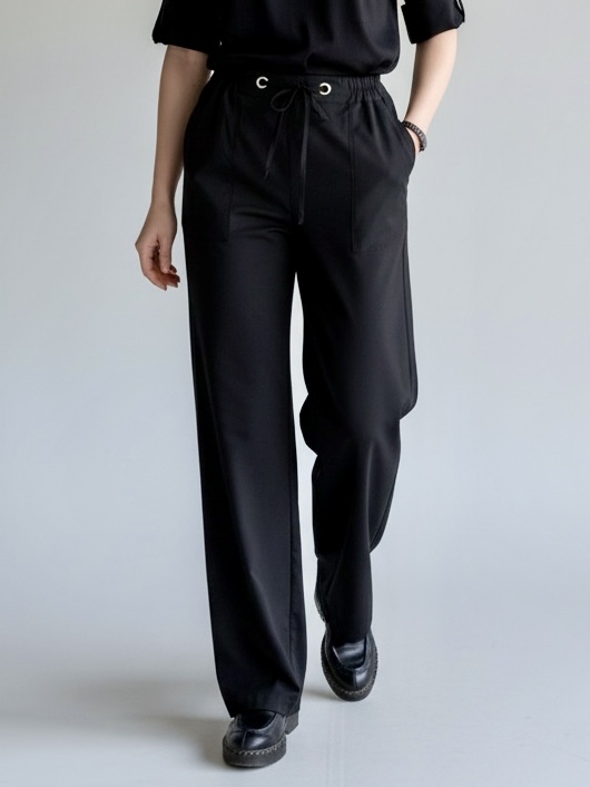 На брюках есть карманы слева и справа. Пояс на широкой резинке с шнурком для утяжки. Максимальный комфорт для сезона весна-лето.