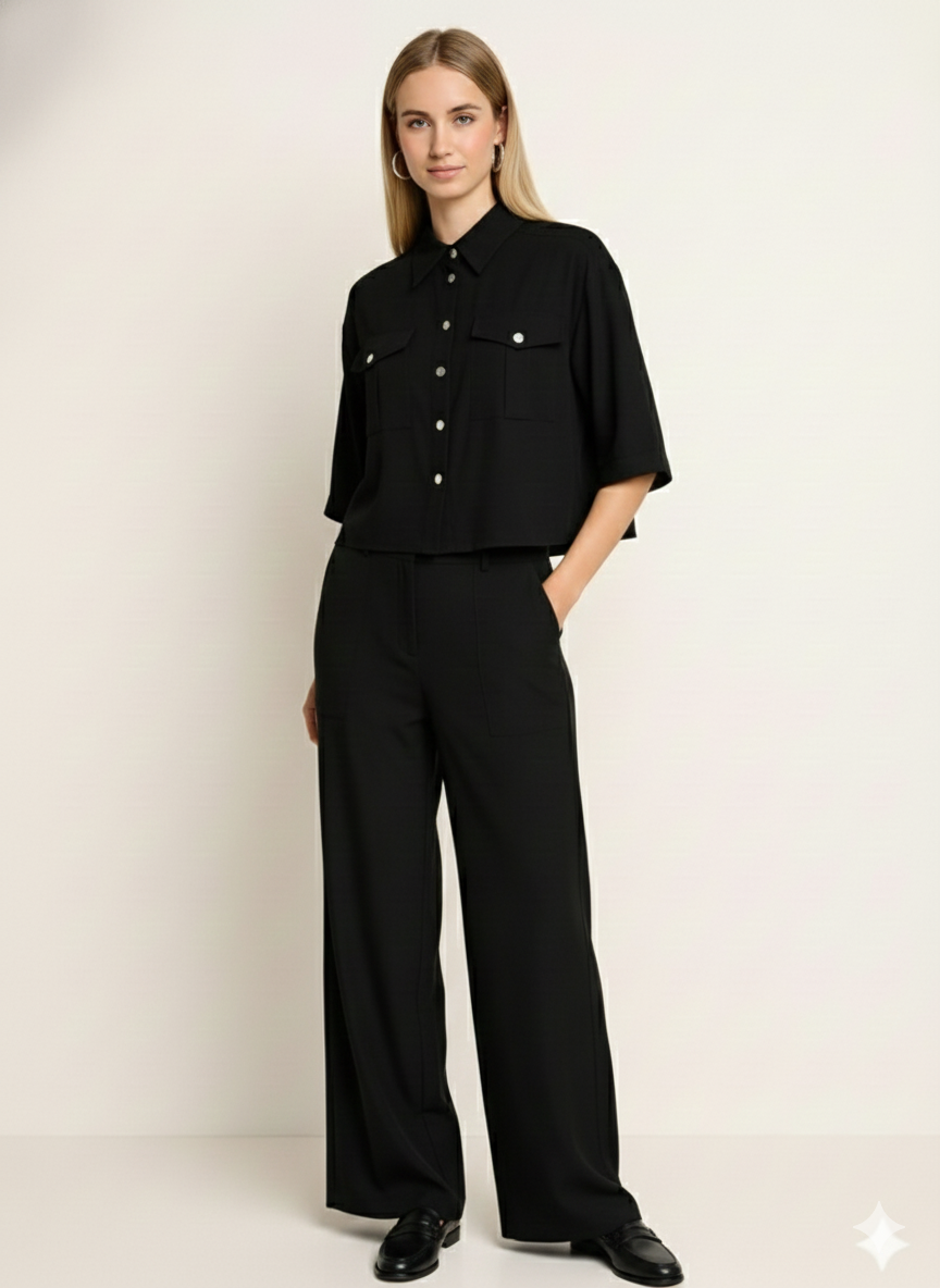На фото: модель размер 46, на ней брюки размер 46/48, рост модели 164 см