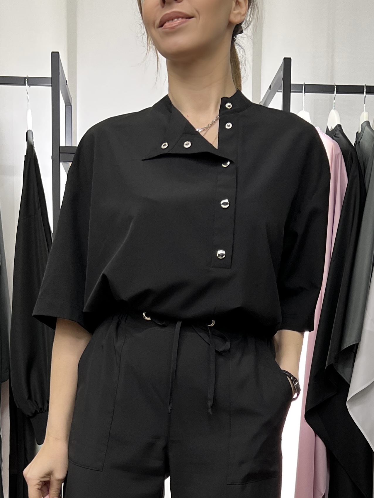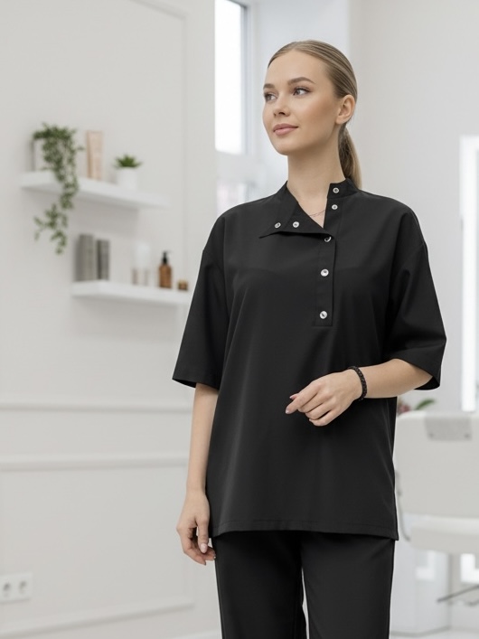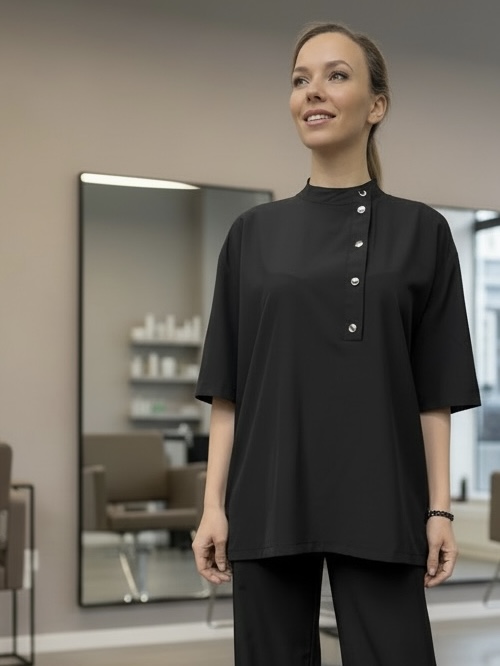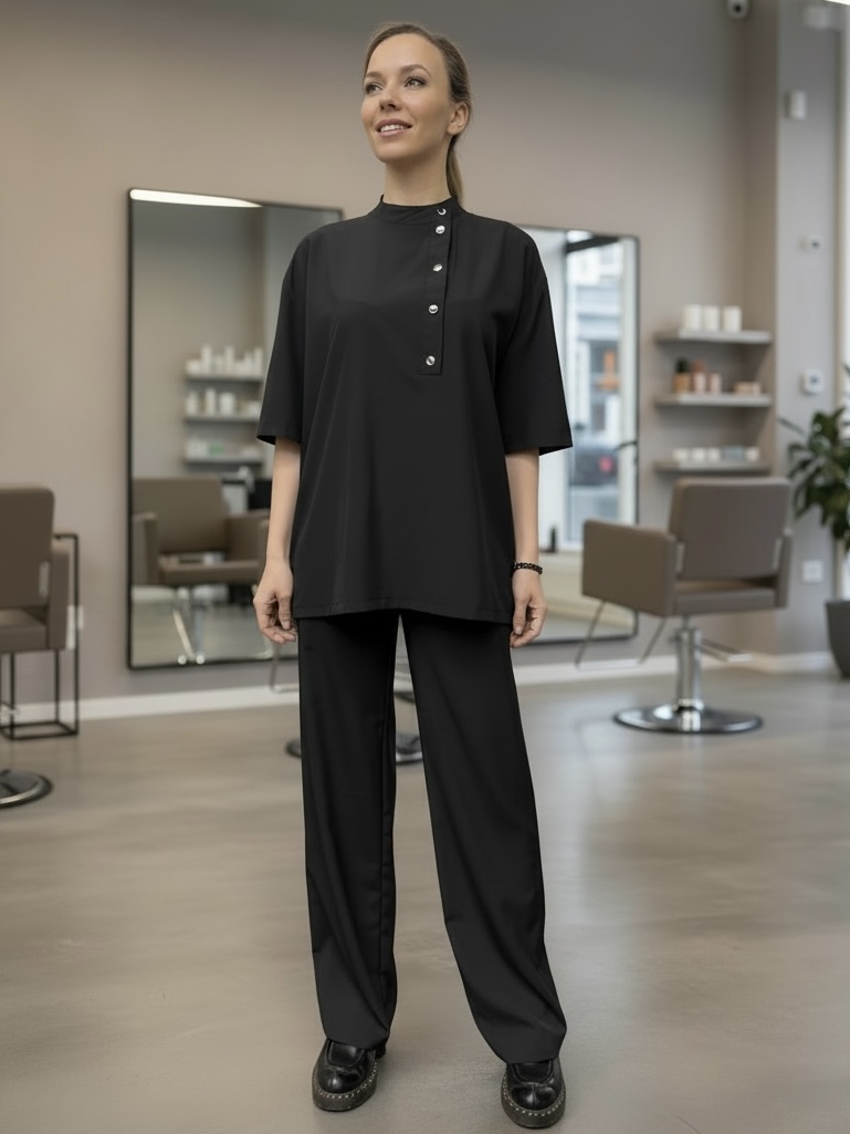 Брюки выполнены из легкой ткани, которая НЕ ОКРАШИВАЕТСЯ И НЕ ОСВЕТЛЯЕТСЯ при работе парикмахера. Брюки имеют длинные и широкие штанины, есть боковые карманы. Застежка на молнию и кнопку. Без пояса.