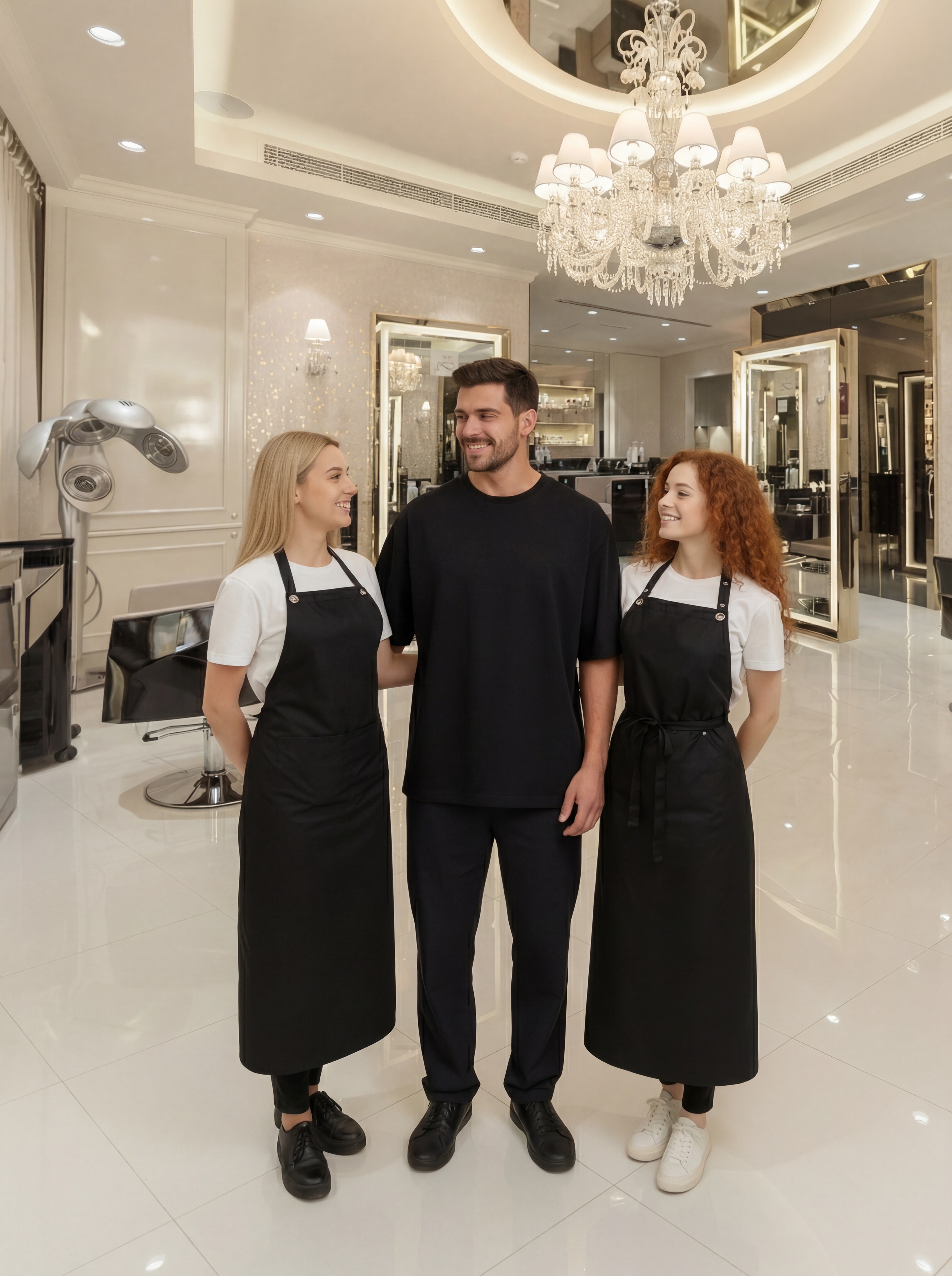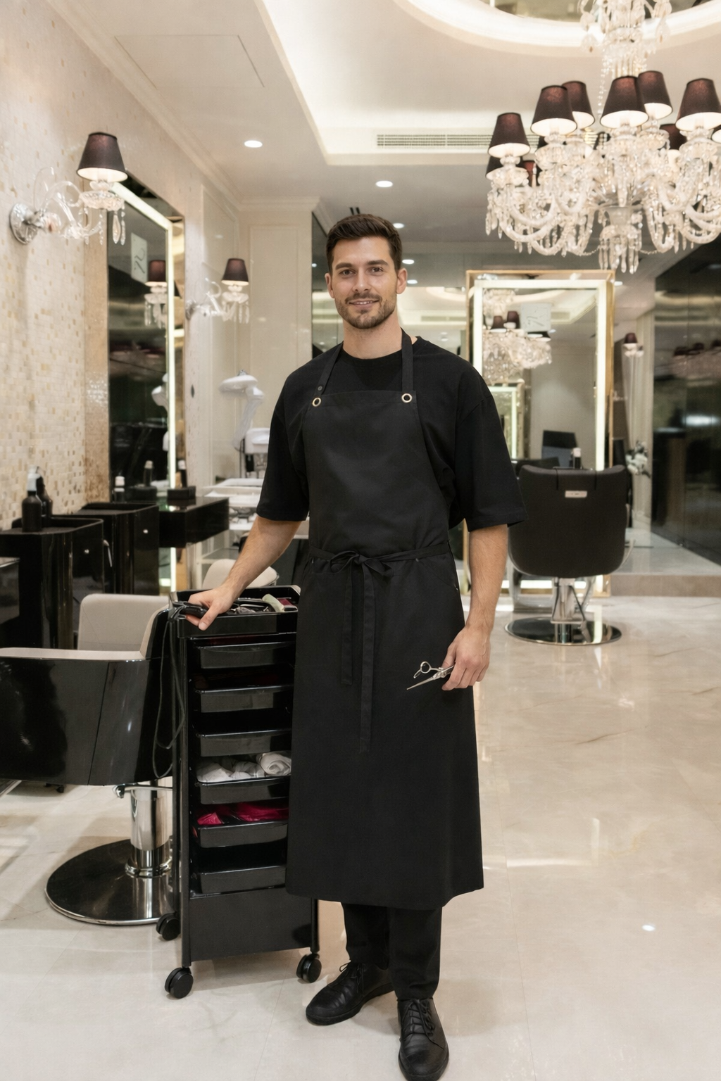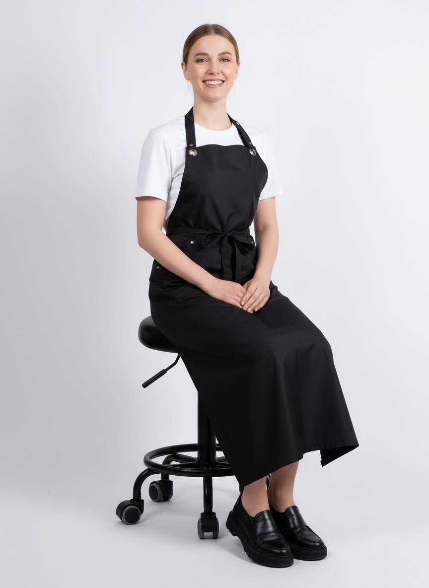 Фартук прямой для парикмахера-колориста из непромокаемой ткани, устойчивой к обесцвечивающим порошкам и красителям.