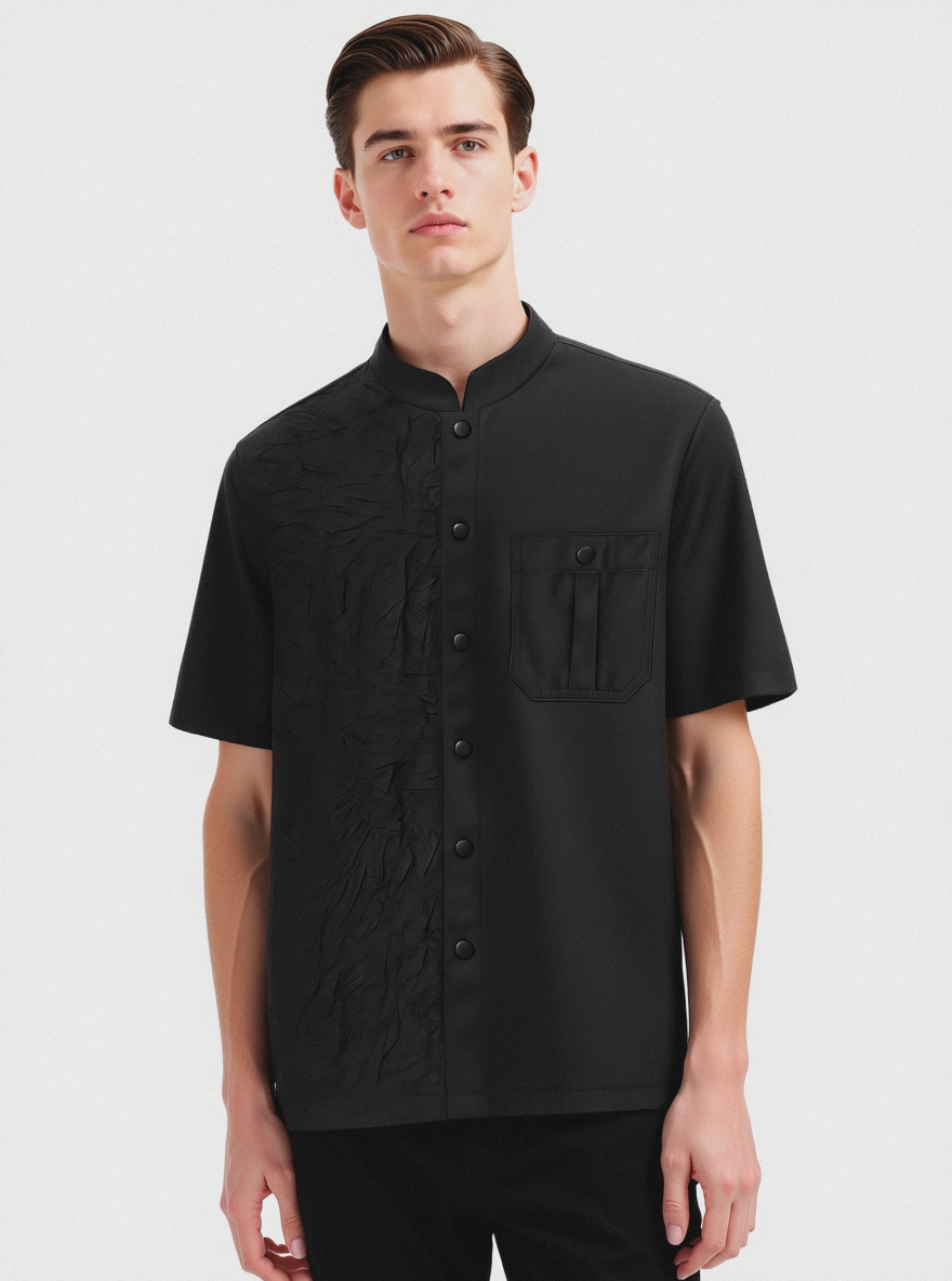 Цвет рубашки черный, правая полочка выполнена из ткани с жатым эффектом.